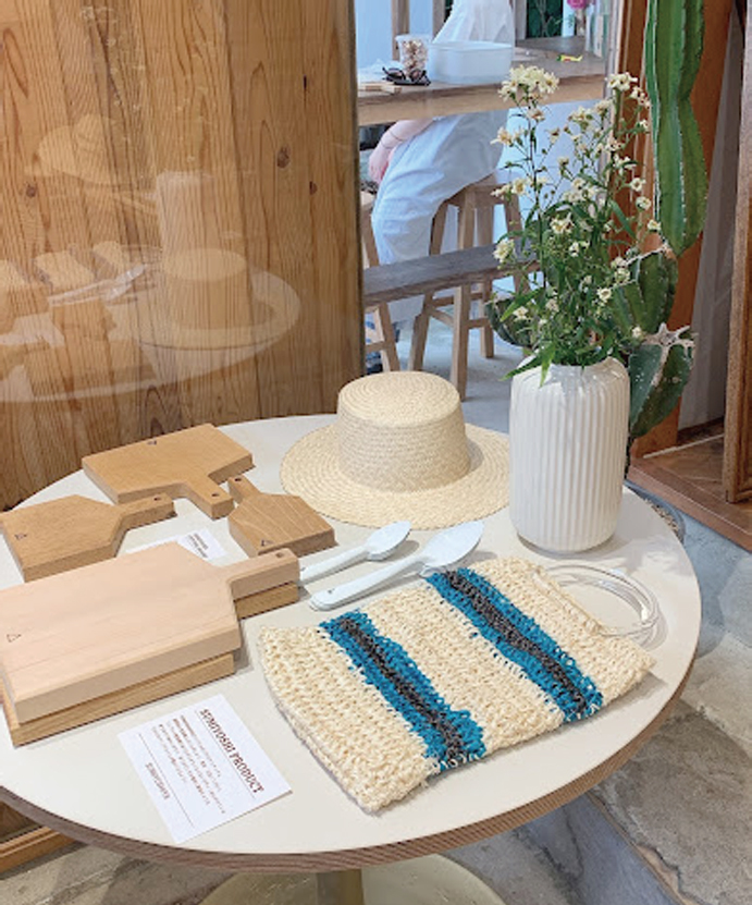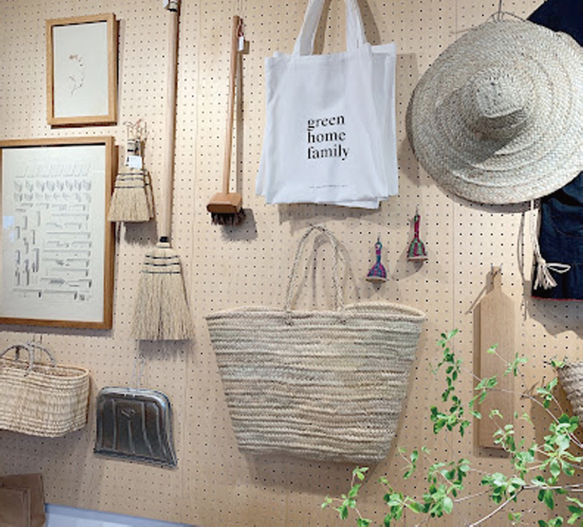 店内はカゴ、BAG などの雑貨やオリジナルのプロダクト商品が並ぶSHOP になっています。