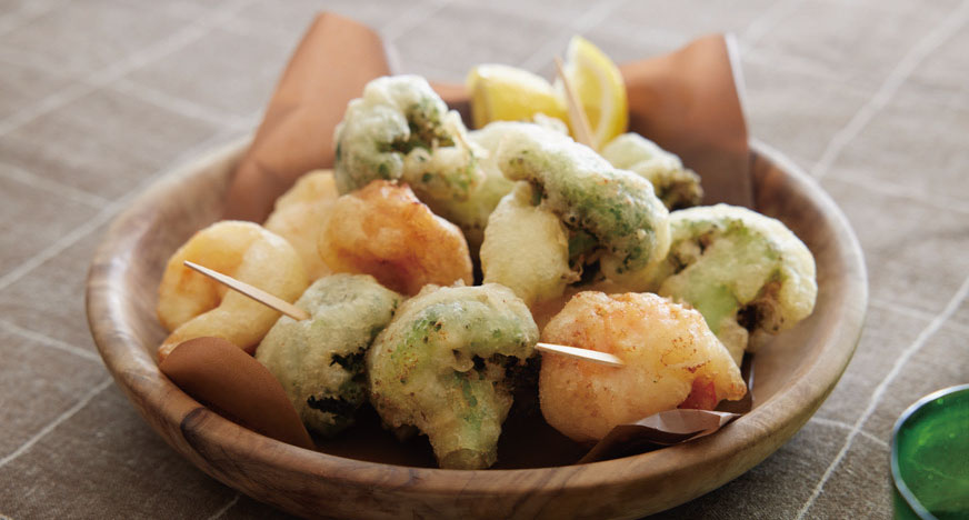 ①ブロッコリーは小房に分ける。エビは背わたを取って洗い、塩少々とコショウを振る。それぞれ小麦粉を薄くまぶす。